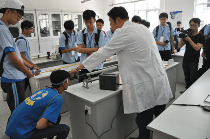 首先,铁中负责人带领台东县高中参访团参观了学校校园,并重点介绍了铁中的发展和具有特色物理化实验室及音乐美术教室,让参访团对铁中的历史文化有了更进一步的了解。
