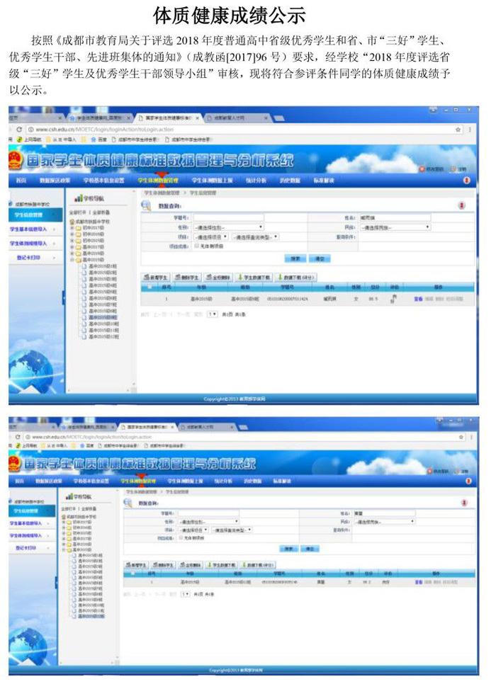 四川省级评优体质健康成绩公示