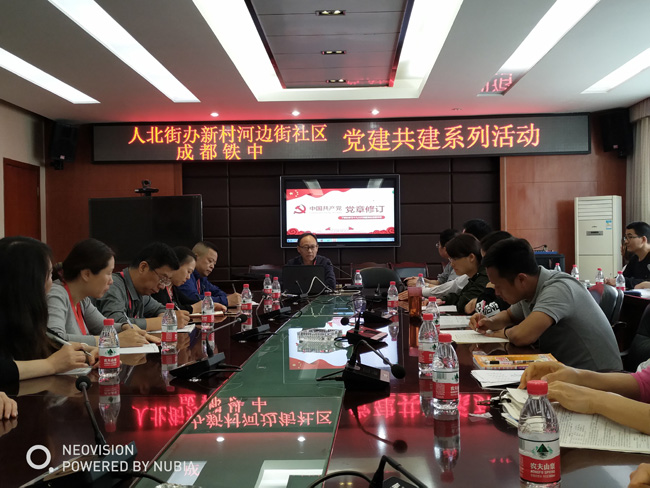 | 4月26日,成都铁中与人北街办新村河边街社区“党建共建系列活动”正式在成都铁中拉开帷幕。成都铁中党委副书记张礼洪主持活动并强调了此次活动的必要性和重要意义。随后,新村河边街社区党委书记马波为两个单位的参会党员上了一堂非常有意义的党课。课程解读了“十九大”对党章的重要修改,分别从“修改背景”“修改内容”“修改意义”等几个方面带领党员同志们全方位了解和学习新党章。最后,成都铁中党委书记吴烈做总结讲话,对社区与学校开展党建共建活动,共同学习提升党组织的凝聚力与战斗力的作法给予了高度评价,并对下一步的活动的内容和形式提出了要求。