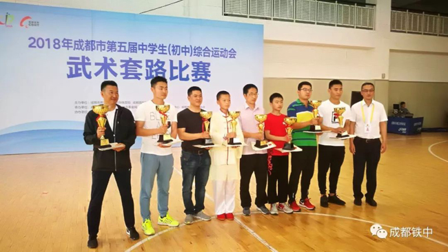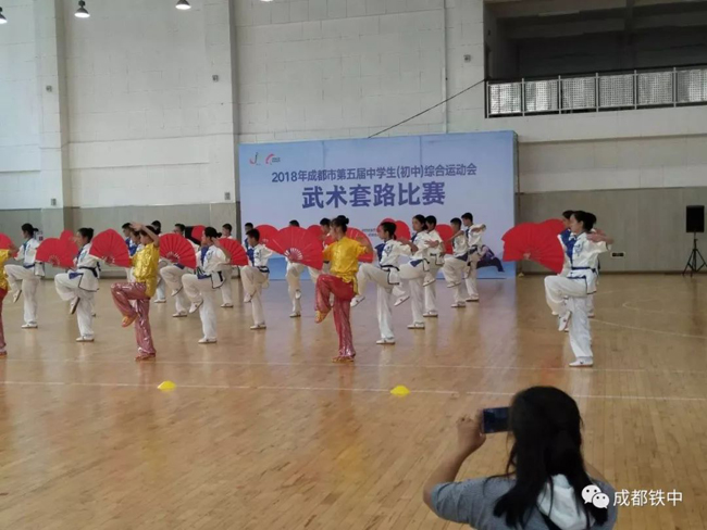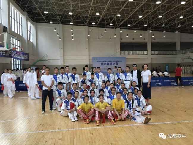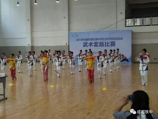 2018年5月4日,阳光明媚,成都市第五届初中生综合运动会武术比赛在高新新华学校举行。由我校负责组织的武术队,代表金牛区参加了此次比赛。成都铁中与成都市蜀西实验学校的学子精诚合作,经过一个半月的艰苦训练,勇夺第一名!展现了金牛学子的阳光,自信的精神风貌!