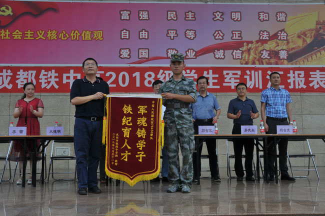 “军魂铸学子,铁纪育人才”。这一语双关的锦旗,既表达了成都铁中对军训部队和教官们的由衷谢意,也时时刻刻提醒着每一位军训学员,用军队“铁的纪律”,用铁中严格的纪律来要求自己,做一名合格高中生!