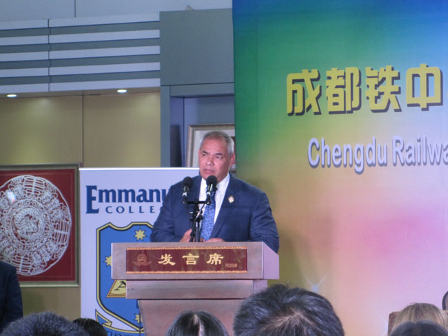 | 2018年9月7日,成都市铁路中学校迎来期盼已久的朋友。成都市“姊妹城市”——澳大利亚黄金海岸市市长汤姆泰特(Cr Tom Tate)及成都铁中友好学校伊曼纽尔学校(Emmanuel College)校长帕特里克英纳斯伊尔(Mr Patrick Innes-Hill)一行9人,于上午10点到达成都市铁路中学校进行友好访问活动。