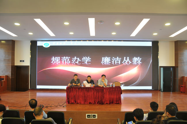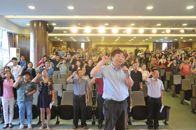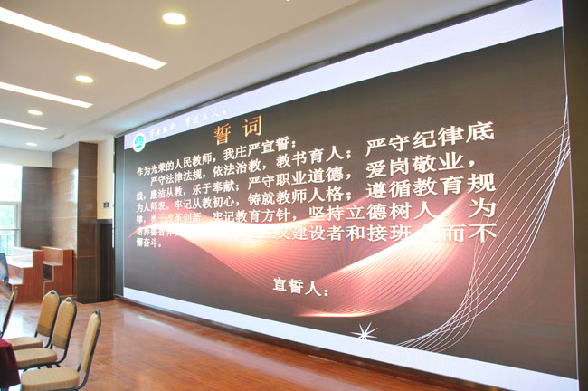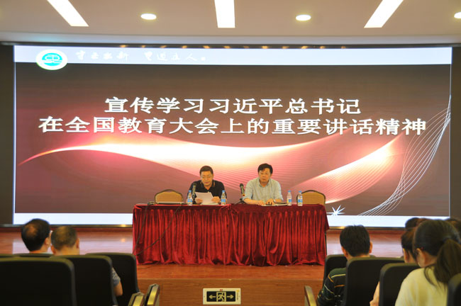 | 9月18日,成都铁中全体教职工在演讲厅开展了一次有意义的师德师风教育活动。此次活动由四个内容构成,校党委书记吴烈主持。首先,以2018年职称评定工作为契机,学校办公室杨自虎主任在为教职工解读今年职称评定原则的时候,特别强调了师德师风的重要性。 接着,学校副校长吴雪峰以“规范办学·廉洁从教”为主题,向全体与会人员进行了一次从理论到实践的“廉洁”解读。 “宣传学习习近平总书记在全国教育大会上的重要讲话精神”亦是本次教育活动的主要内容。杨云雄校长言辞恳切,认真向教职工宣读总书记讲话精神,且联系学校实际,晓之以理,动之以情。最后,吴烈书记领誓。面对我们所忠诚的教育事业,成都铁中全体教师庄严宣誓,立志为培养德智体美全面发展的社会主义建设者和接班人不懈奋斗!