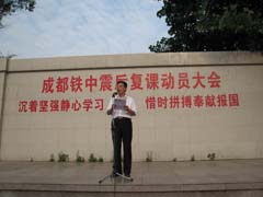 今天,我们成都铁中三千余名师生,平安地返回了我们美丽的校园,聚集在我们熟悉的操场。可能有的同学对地震还心有余悸,可能有的同学因地震的伤害还不能平息那无尽的伤痛。但请同学们相信,我们成都铁中200名教师一定会和3000名同学肩并肩站在一起,携手面对一切苦难;请同学们相信,我们的教学楼经专家鉴定,是坚固抗震的,是安全的;我更相信,我们成都铁中所有的师生员工都是勇敢坚强、沉着冷静的。