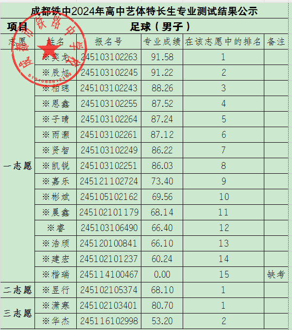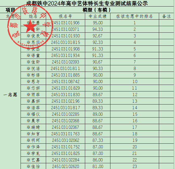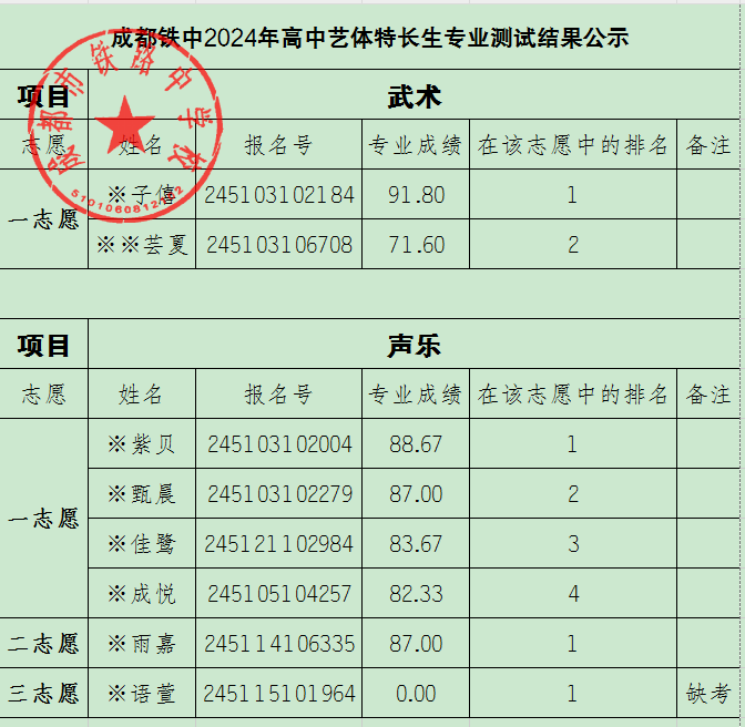 成都铁中2024年高中艺体特长生专业测试结果公示