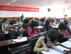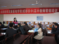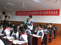 成都铁中作为成都市的教师发展基地校,承担了面向成都市高中教师的常规培训。2012年3月19日,我校谭铁老师上了一节英语培训课。上课内容:Book6,Module4,Music 的主阅读课。