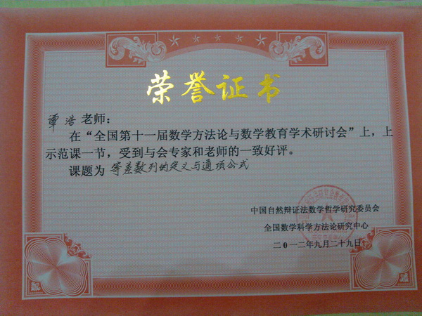 谭浩老师在此次会议上执教示范课《等差数列》,受到与会专家和老师的一致好评,并因此获得大会颁发的荣誉证书(会上一共12位教师上示范课,获得荣誉证书者仅4位)。在全国同行面前充分展示了成都铁中的教师风采。