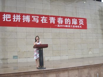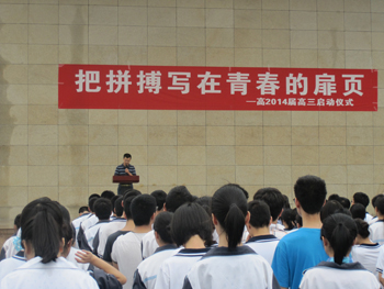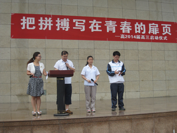 下午16时整,高2014届13个班七百余名同学整齐列队在大操场,四名主持人齐声播报“距离2014级高考还有351天”,启动仪式正式开始。在两位老师和四名同学的带领下,全场师生庄严宣誓,立志“把拼搏写在青春的扉页”,为创造辉煌成绩奋战一年,为绘就精彩人生打下坚实基础。接着,蔡嘉伟老师以自己十七年前备战高考的亲身经历为同学们加油打气,他轻松幽默的发言激起连连笑声,缓解了会场的紧张气氛。