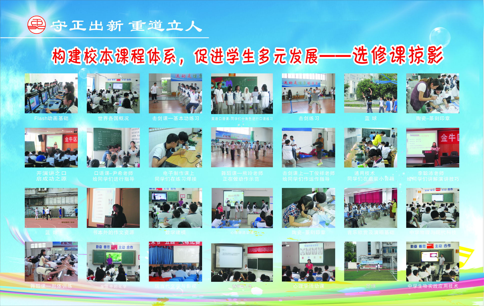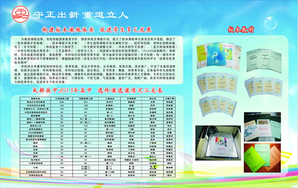 为推进课程改革,我校依据国家教育方针、国家和地方课程计划,建立了校本课程审议委员会和开发组,制定了《校本课程开发指南》、《校本课程开发方案》、《学生选修课程目录与课程介绍》,组织有经验、有特长的教师编写了《岁月如歌》、《诗词鉴赏十八般武艺》、《作文教学资源整合录》《书本外的作文资源》、《直升班阅读教程》、《中学生物实践应用技术》《工艺品制作》《哲学与人生》《我国城乡居民如何投资理财》《FLASH动画制作》等教材。内容涵盖诗歌鉴赏、家庭教育、学科知识应用研究等方面。其中由高中语文组编写的《岁月如歌》和《城市中学生家庭教育现状及干预策略研究》课题组编写的《改变从我们开始》两本校本教材被成都市教科所评为“成都市优秀校本教材”。