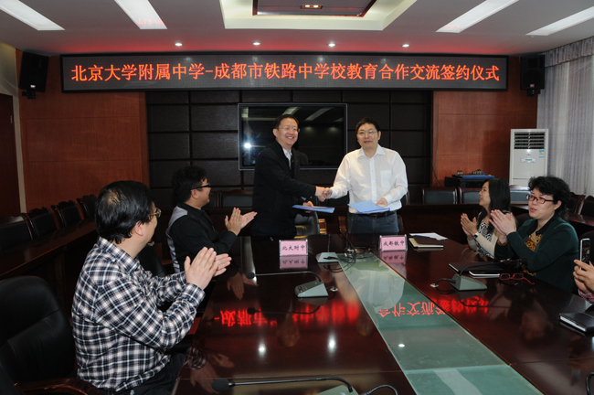 | 4月14日,成都铁中与北京课改名校——北大附中签订了教育合作交流协议书,拉开了两校合作的序幕。协议商定,两校根据各自学校实际情况,互派教师进行教学交流,向对方学习先进的教育教学理念、方法和经验,兼任一定课时的专业课;向对方教师传授本校教育教学的经验和方法,进行教育教学改革的尝试。