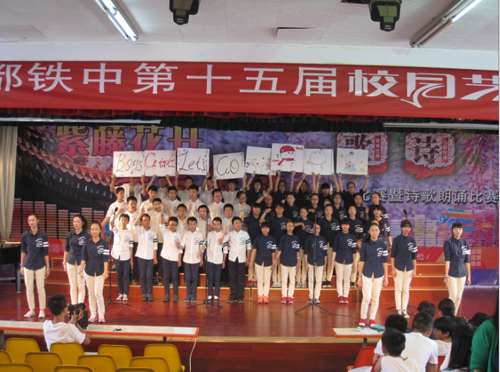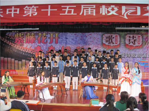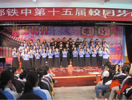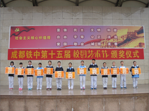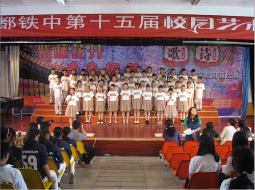 2015年5月21、22日,“成都铁中第15届校园艺术节”系列活动在成都铁中演讲厅隆重举行。此次系列活动包括高2017届歌咏比赛、初2016届配乐诗朗诵比赛、初2017届歌咏比赛,紧紧围绕“紫藤花开·青春绽放”各个活动让整个校园都沉浸在浓浓的艺术氛围中。