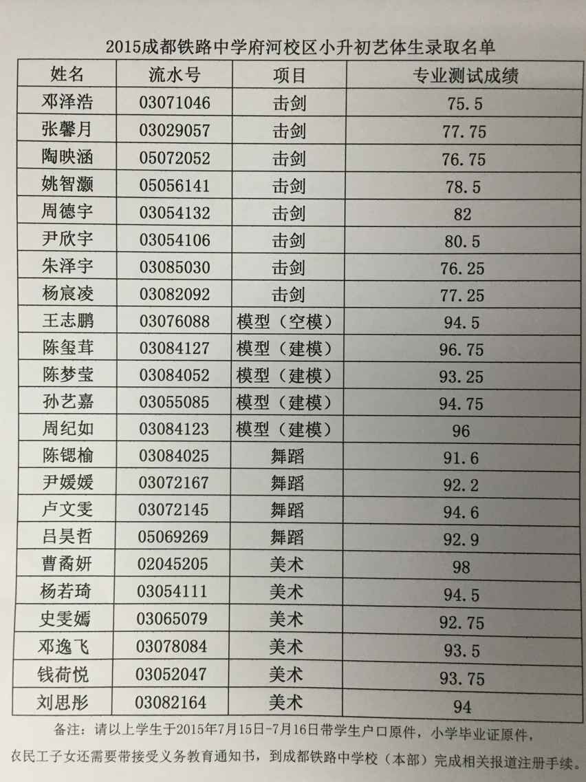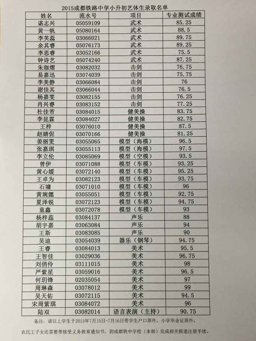 2015年成都铁中、成都铁中府河校区小升初艺术体育特长生预录名单