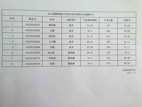 艺体特长生成绩公示