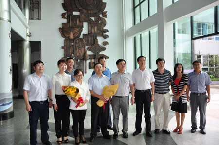 | 二零一五年九月六日下午,时值教师节来临之际,中共成都市金牛区委唐华副书记,金牛区人大常委会张文友主任,邓举副主任,区教育局纪工委卢远智书记,区教育局许娅副局长一行来到成都铁中。在杨云雄校长的介绍中,领导们参观了焕然一新的铁中校园,领略了丰富的校园文化后,对成都铁中优秀的教师代表表达了最诚挚的慰问。成都铁中物理教师、省特级教师曾明同志与学校英语教师、区优秀班主任郭君同志作为代表,接过鲜花的同时,对区领导们的亲切慰问表示了衷心的感谢,并保证在未来的教育教学工作中再接再厉,继续发扬铁中教师优良传统,为祖国培养更多的人才。