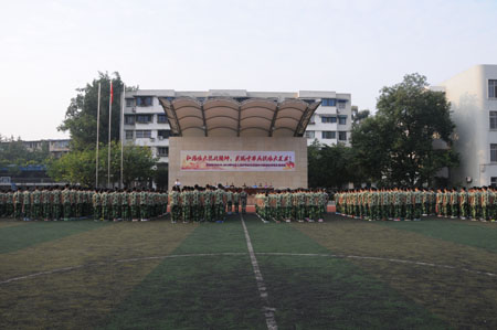 为纪念中国人民抗日战争暨世界反法西斯战争胜利70周年,大力弘扬爱国主义精神,加强爱国主义教育,激发师生爱国主义热情,教育师生在现代和平条件下牢记历史,努力工作学习,奋发向上,成都铁中于2015年9月1日早上举行“弘扬伟大抗战精神,实现中华民族伟大复兴”2015—2016学年度上学期开学典礼暨高2018届新生军训汇报表演。
