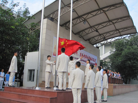 在庄严的国歌声中,鲜艳的五星红旗冉冉升起,全体师生都心怀着激动。学生会、校团委的学生代表向全校同学致辞。接下来杨云雄校长对全校师生及学校的新目标和新责任发表了热情洋溢的讲话,勉励全校师生弘扬伟大抗战精神,为实现中华名族伟大复兴的中国梦而奋斗!紧接着来自高2018届的新生代表陈思佳同学也在发言中表示将会发扬军训精神,将进入成都铁中的骄傲和自豪迅速转化成拼搏进取的决心、勇气和毅力,勤奋学习、勇攀高峰。