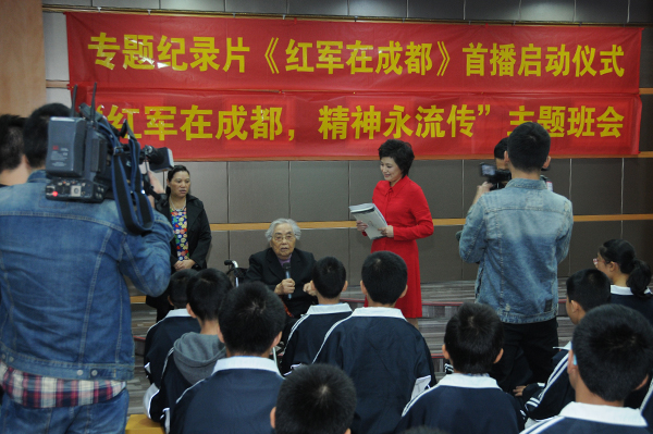 | 在省、市、区十多家媒体的高度观注中,成都电视台“今晚8:00”栏目大型电视专题纪录片《红军在成都》首播启动仪式暨“红军在成都”主题班会于今日在成都铁中隆重举行。在“红军在成都·精神永流传”的主题班会及纪录片启动仪式上,95岁的老红军李洪翔为大家讲述了自己参加革命,随军长征的故事,还给同学们带来了当年抗战缴获的珍贵战利品——一床日军所用布毯。中共成都市委党史研究室专家沈利则给同学们带来了党史研究室的新书《红军在成都》,生动地给大家讲述了红军当年在成都建立革命根据地,和老百姓共同生活、抗战的故事。通过这次活动,铁中学子再次接受到意义非凡的爱国主义教育,而且对“红军在成都”也有了更深入的了解。