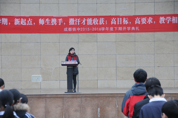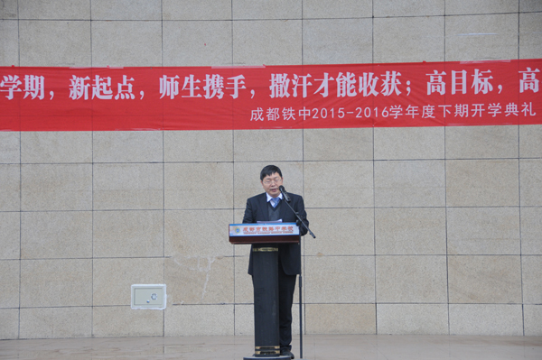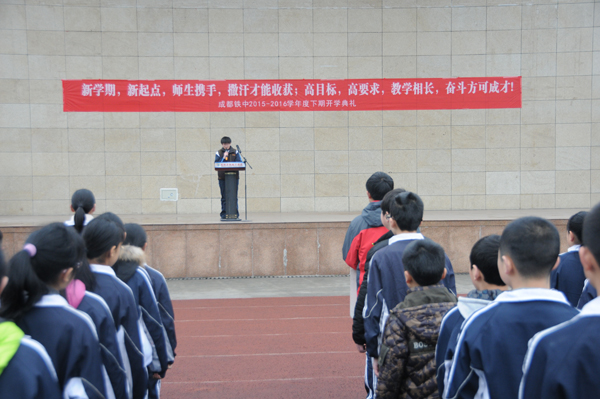 | 成都铁中2015-2016学年下期开学典礼于2016年2月24日上午隆重举行。庄严的升旗仪式,整齐的教师队伍,精神饱满的莘莘学子,在春寒料峭的今天仍然展现出我铁中重道守正之风范!