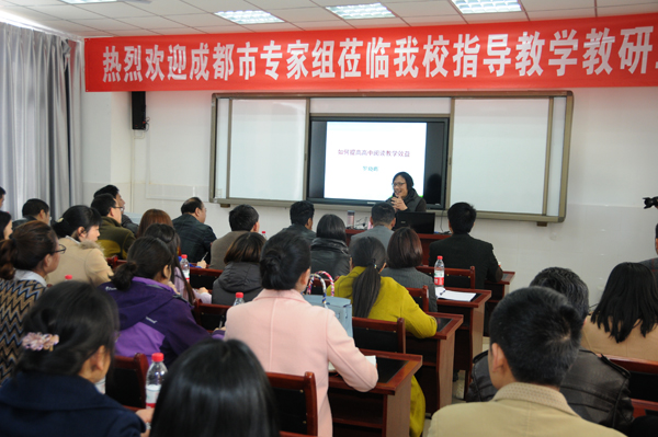 接下来,成都市铁路中学英语教师邓琰首先作了题为《没有规矩,不成方圆》的报告,她从班主任工作、教学工作、和工作细节的落实三个方面给我们作了详细讲授。罗晓晖老师作了题为《如何提高高中阅读效益》的专题讲座。罗老师从阅读的教学效益,虚心阅读原文,阅读具体实施,提升语文教学质量等几个方面为甘孜州老师们指明了阅读教学的中注意的问题以及解决措施。