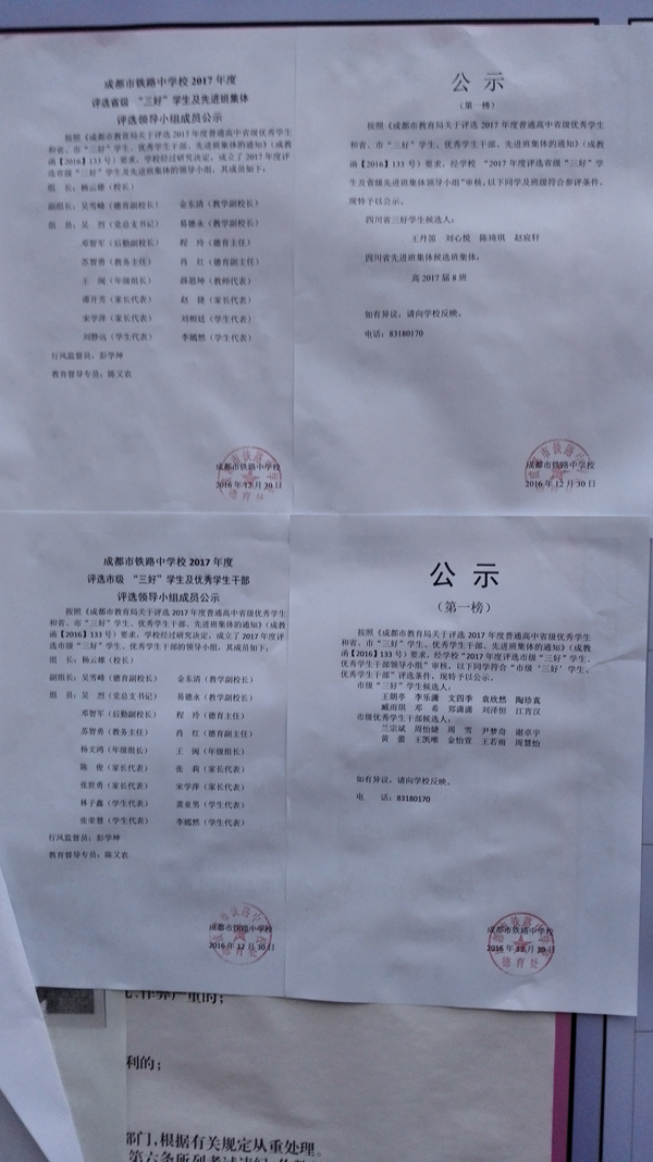 成都铁中评选2017年度省市三好学生、优秀学生干部、先进班集体公示(第一榜)