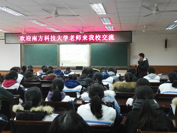 | 2017年1月10日,南方科技大学生物系黄巍教授一行到成都铁中进行招生宣传。黄教授为铁中学子详细介绍了南科大的基本情况和2017年的招生安排(招生数量及学科设置),并耐心为同学们解答相关问题。