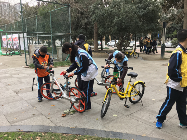 3月5日下午,志愿者们齐集在洞子口职高的操场上举行开幕式。开幕式上,各发起学校志愿者代表联合发表了“我爱成都------卫单车、促文明”的倡议书,教育局副局长孙丹同志为志愿者们递交了单车护卫行动装备并鼓励志愿者们多为建设美丽成都作贡献,多传递正能量。随后,各志愿者代表队身着志愿者服,执旗帜,骑着共享单车前往成都市各大共享单车停靠点,一路清洗单车、维修单车、给单车充气、系上文明用车的温馨提示、引导市民文明使用共享单车。