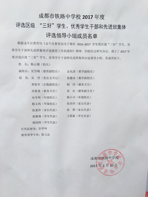 成都市铁路中学校2017年度 评选区级 “三好”学生、优秀学生干部和先进班集体”评选领导小组成员名单及公示第一榜