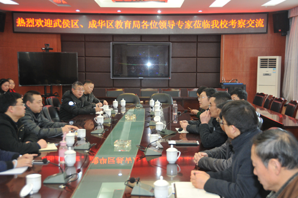 | 继2017年3月14日下午签订合作协议之后 ,昨日,简阳养马中学教务处张主任及实验老师一行来到成都铁中,参加由金牛区教育局设备科组织的“四川省实验示范学校评估”经验交流会。来自成华区和武侯区教育局相关领导和老师到会。我校杨云雄校长在会上作了经验交流。养马中学的老师们听了学校实验教学经验交流,在现代教育技术主任李主任的陪同下参观了学校的理化生实验室,了解了更多实验教学及管理方面的内容。
